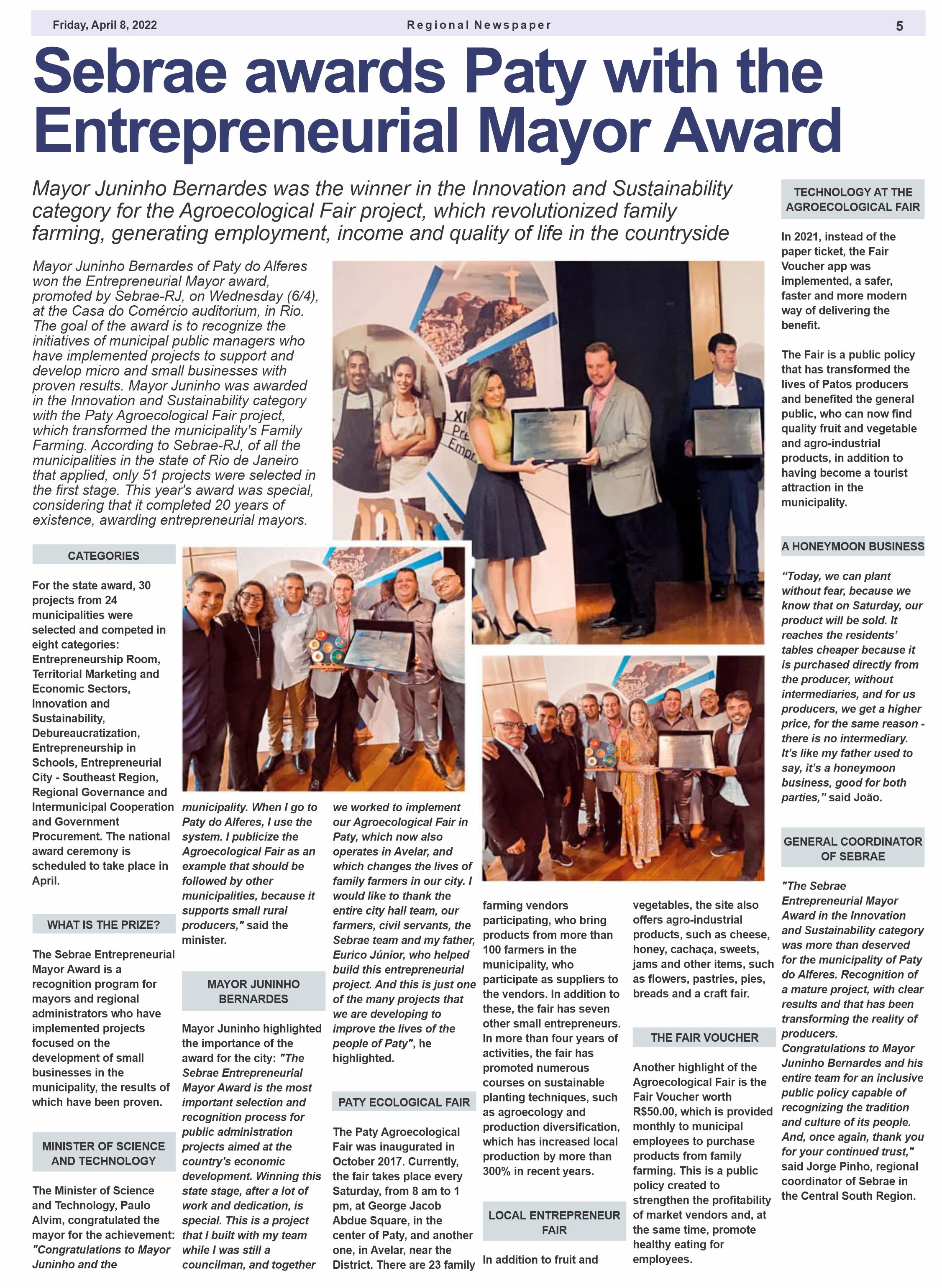 En su primer año de funcionamiento, el ayuntamiento de Paty do Alferes ganó el premio en la categoría Innovación y Sostenibilidad, en el concurso Prefeito Emprendedor, promovido por Sebrae Rio.